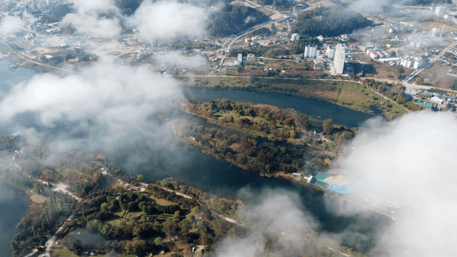 Aerial view of a river and surrounding landscape