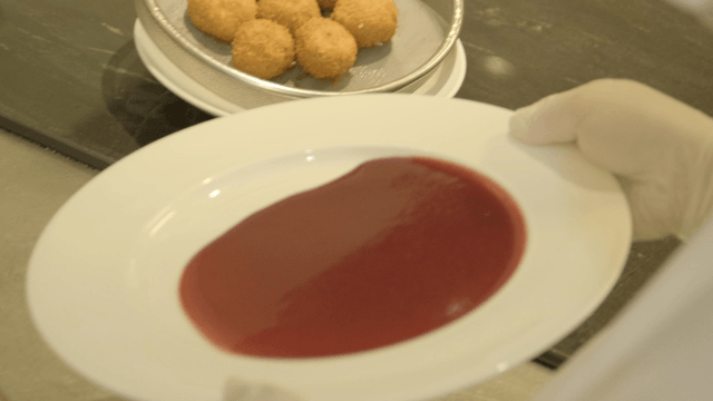 Chef preparing food in a bowl with soy sause with wild chive in the kitchen