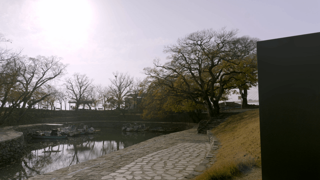 Peaceful lakeside with boats and trees