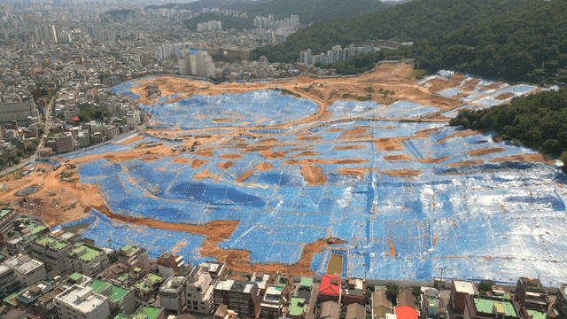 Large construction site with blue tarps
