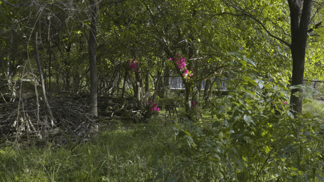 Dense forest with blooming pink flowers and scenic mountain backdrop