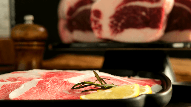 Freshly sliced marbled beef with lemon