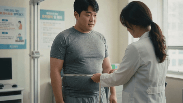 Nurse measuring overweight man's waist in examination room.