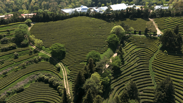 Green Tea Plantation at the Foot of a Rocky Mountain Range
