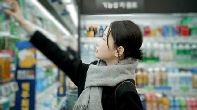 Woman sitting alone by the window on a rainy day, drinking soju.