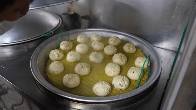 Meat dumplings, kimchi dumplings, and steamed bun being prepared at a large steamer