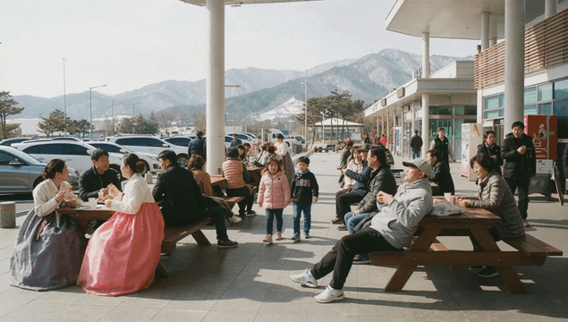 Family of men dressed in hanbok gathered in front of ancestral rite table