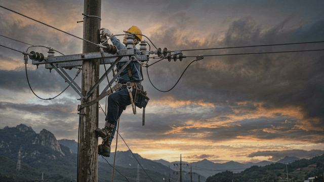 Workers hanging from power lines to inspect transmission towers in mountainous areas