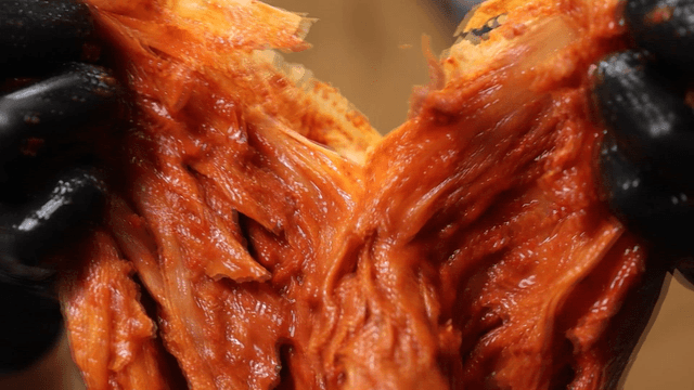 Piece of aged kimchi torn apart and eaten with gloved hands