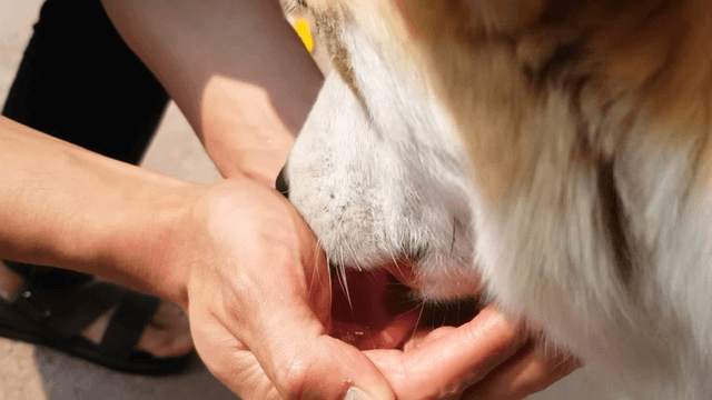 Small poodle dog resting next to crates of tomatoes in a produce warehouse