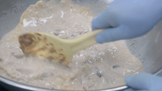 Mixing of thick white batter in a large bowl using wooden spatulas