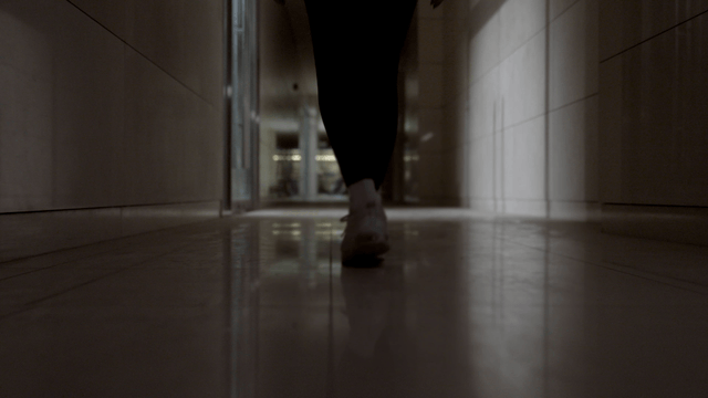 Person walking down an indoor staircase in the dim light of a building's hallway