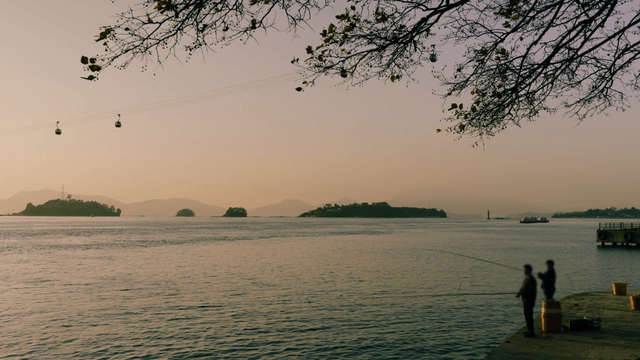 Fishing by the riverside at sunset