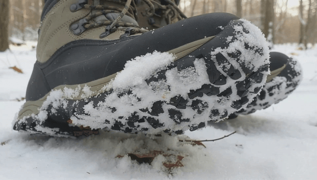 Snowball on snow-covered sole of boot