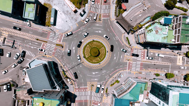 Aerial view of a busy urban roundabout