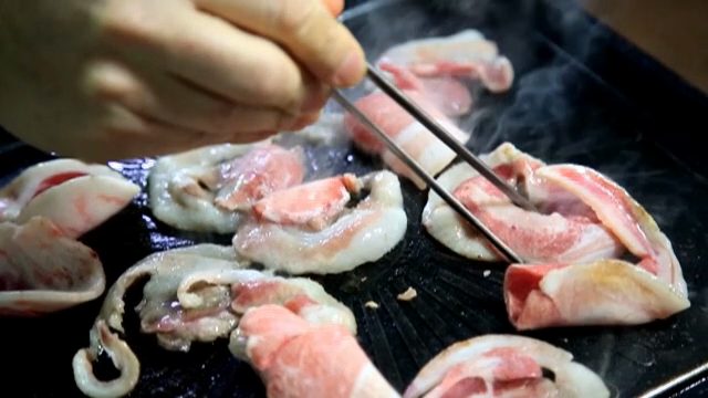Grilling pork belly on a hot pan