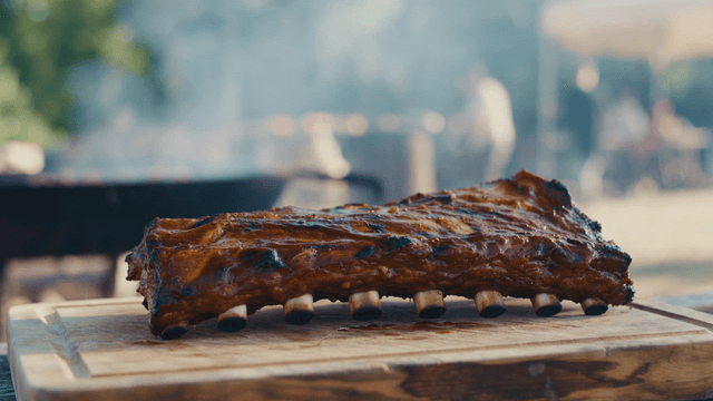 Slicing barbecued ribs on a cutting board