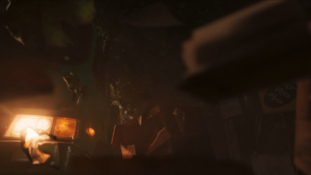 Traffic lights visible through leaves swaying in the night breeze