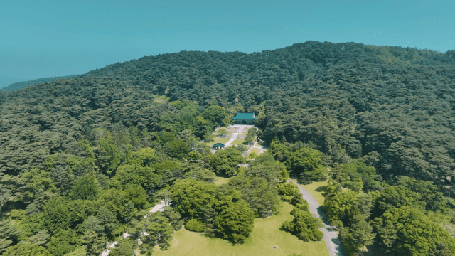 Traditional Hanok shrine surrounded by lush forest
