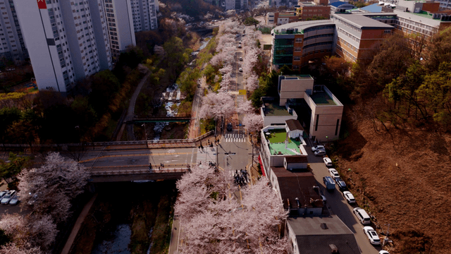 Cherry blossoms blooming along riverside road of apartment complex