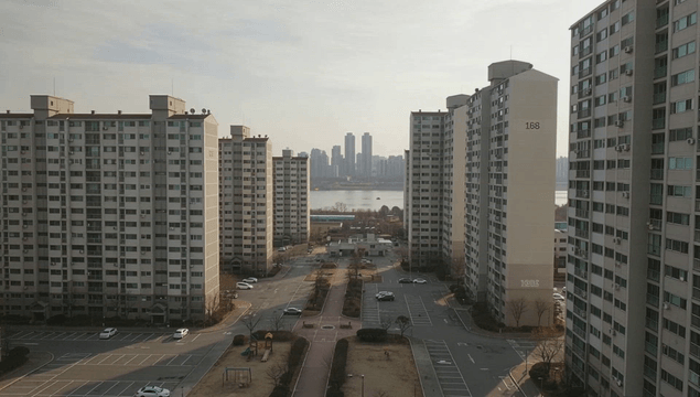Apartment Complex with Cherry Blossoms on a Sunny Spring Day