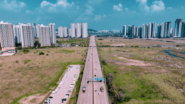 Highway leading to city with high-rise buildings