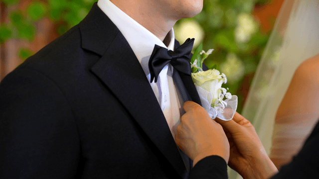 Groom putting flowers on his suit