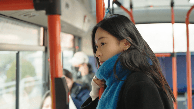 A woman listening to music on a bus