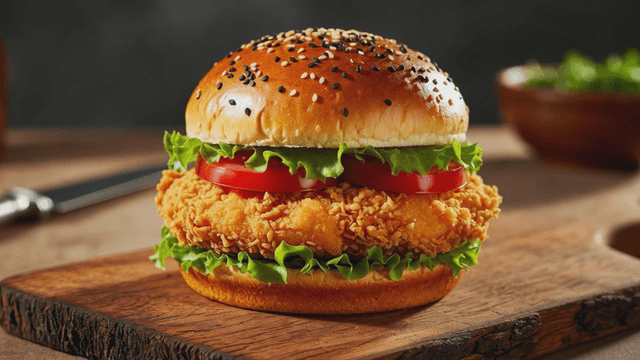 Crispy chicken burger on a wooden table