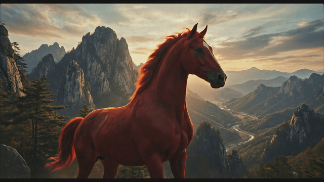 Majestic red horse standing on two legs on rocky cliff at sunset