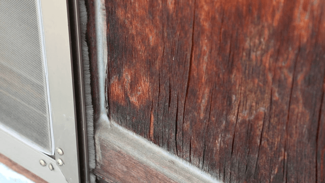 Close-up of a window frame with peeled sealant