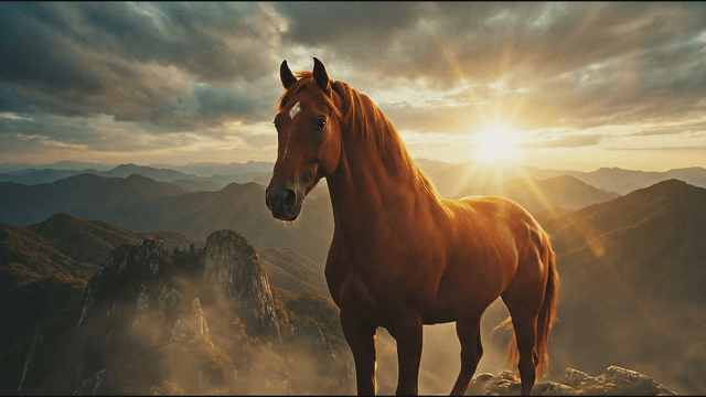 Majestic red horse standing on two legs on rocky cliff at sunset