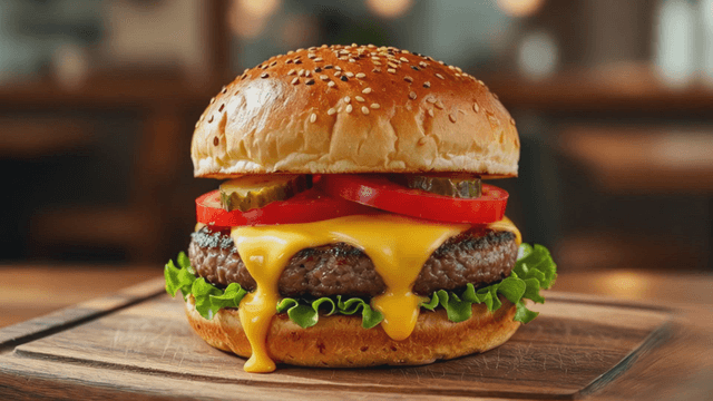 Juicy cheeseburger plated with fresh tomatoes and onions