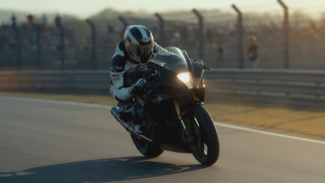 Motorcyclist riding a motorcycle with a helmet in a green forest