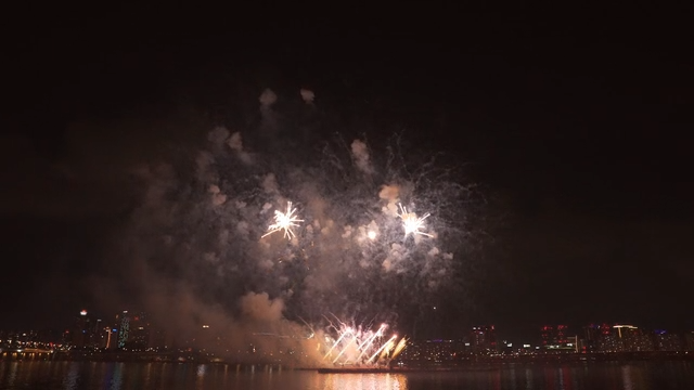 Colorful Fireworks Display Over the City Skyline and River