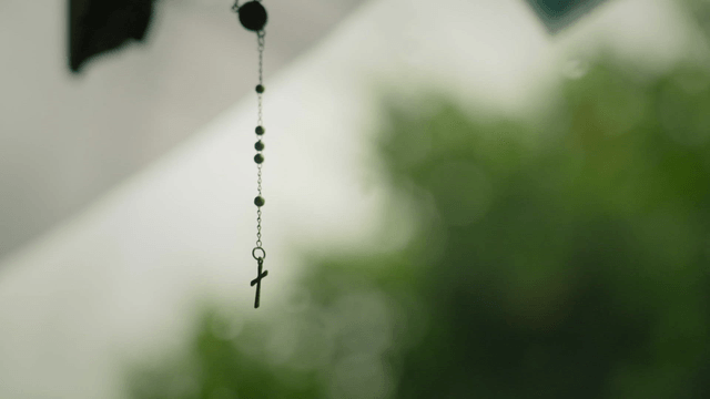 Old man holding prayer bead bracelet with cross on it