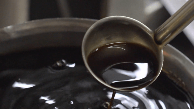 Pouring thick black soy sauce from a wooden ladle outdoors