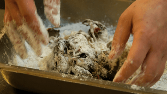 Chef preparing kimchi dumplings by filling them with thin dumpling skins