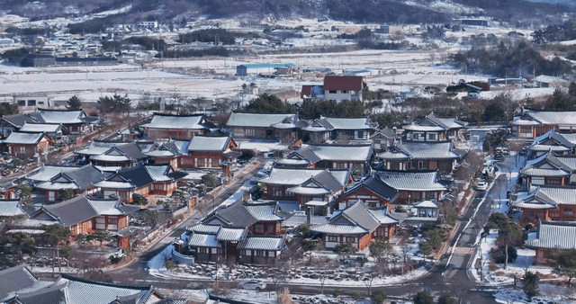 Traditional Hanok village next to snow-covered field