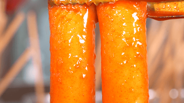 Picking up a Hot, Shiny Tteokbokki with a fork