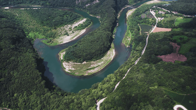 Aerial View of Serene Donggang River Meandering Through Lush Landscape