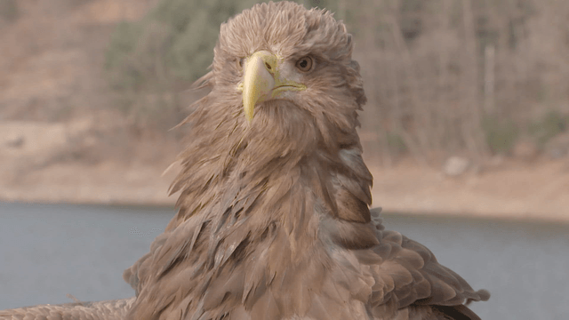 Eagle shaking off water by riverside