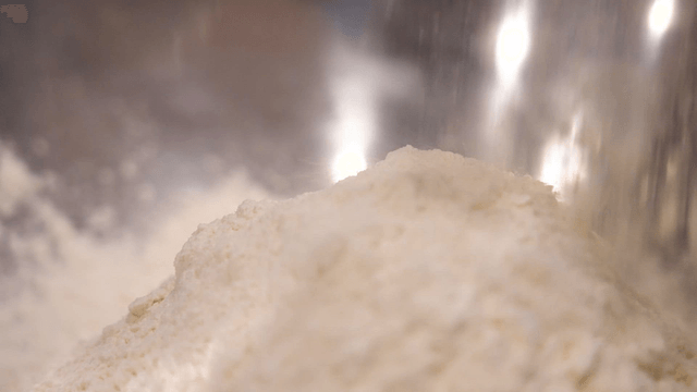 Person in gloves cracking an egg into a mixing bowl on a wooden counter