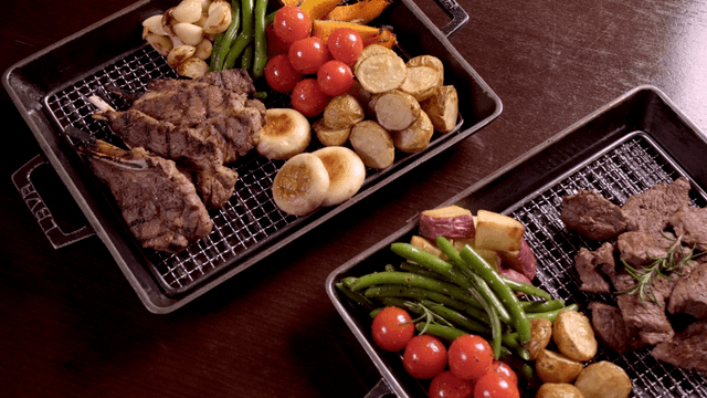 Grilled steak and vegetables on trays