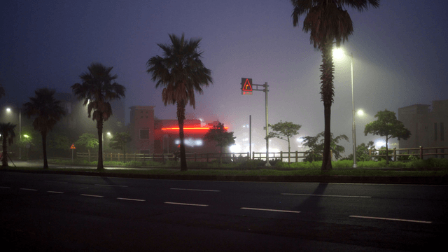 Palm trees by the beach with a road nearby