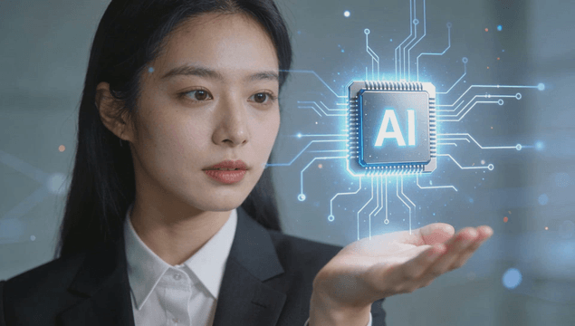 Working woman looking at AI chip