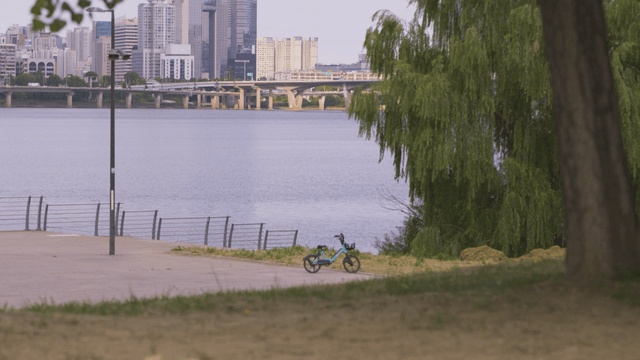Riverside City with Red-roofed Buildings and Boats on a Sunny Day