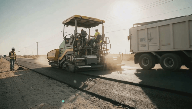 Road construction with asphalt paving