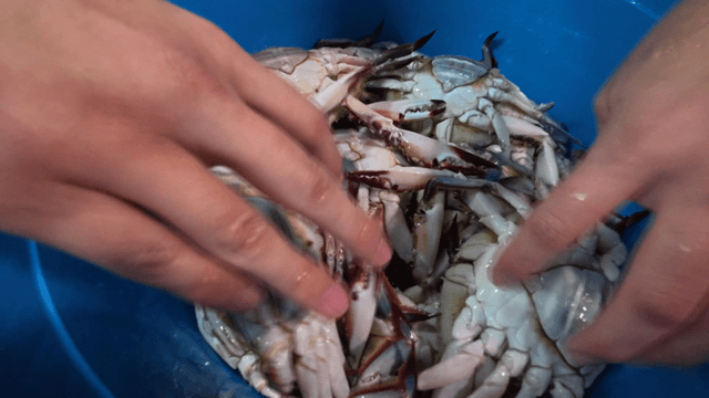Preparing crabs in a stainless steel bowl