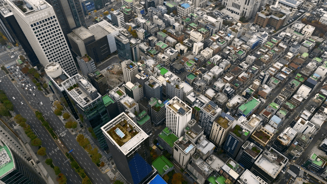 Bustling cityscape at night with lit skyscrapers and lively traffic near a river